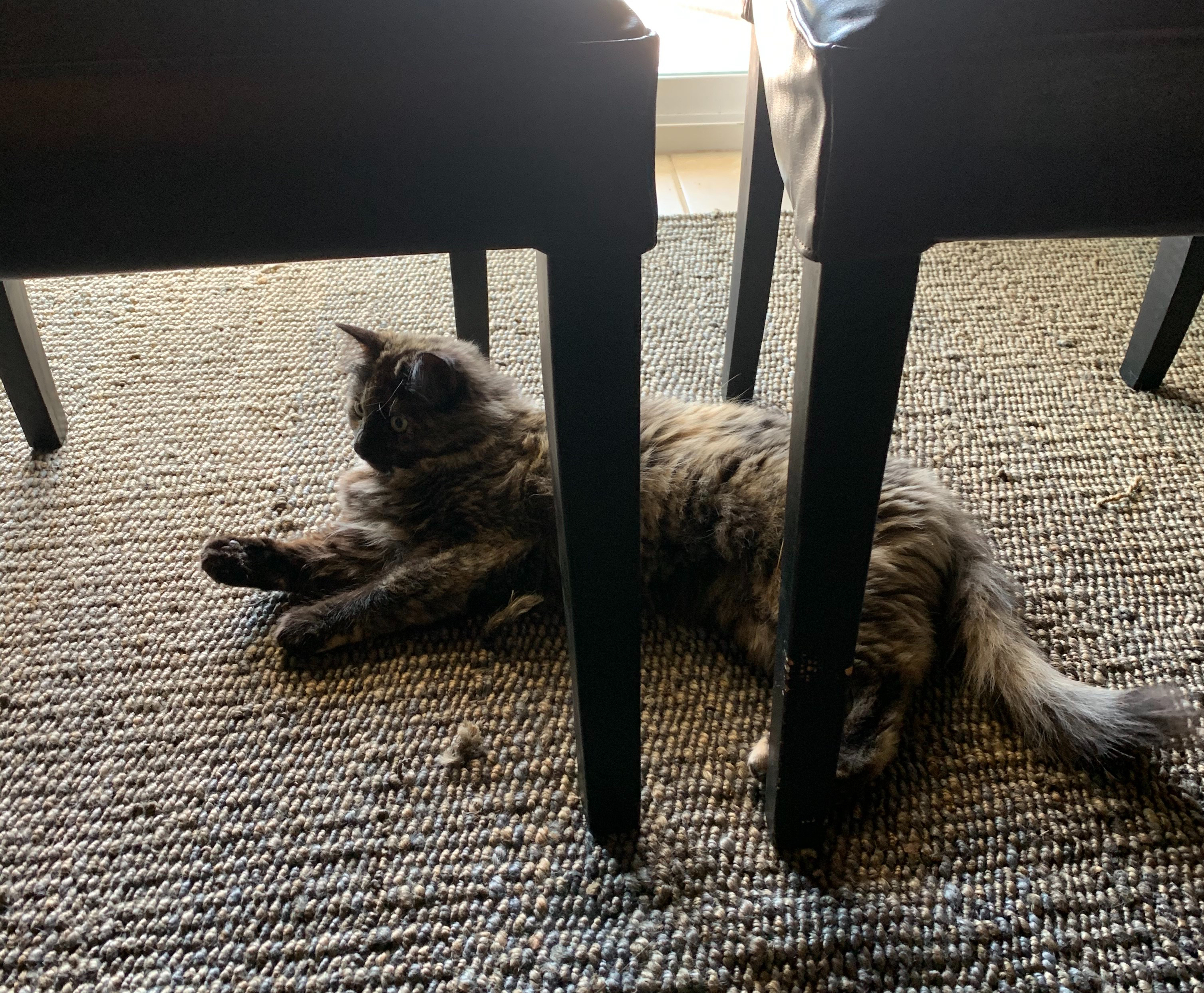 Pippin is a wild one. She came to our yard about a year ago as a feral kitten. We have domesticated her somewhat but she still climbs trees, onto the roof, and hunts all kinds of creatures—from pigeons to lizards to insects.